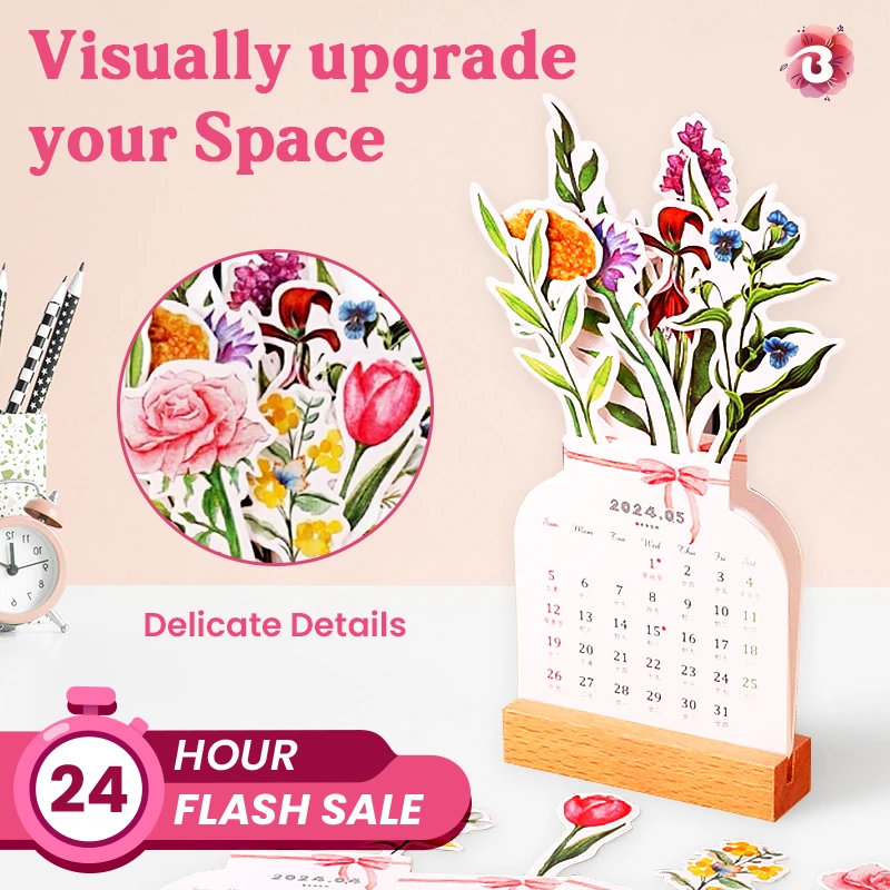 Package Includes: 1 x 2024 Bloomy Flower Calendar + Wooden Stand